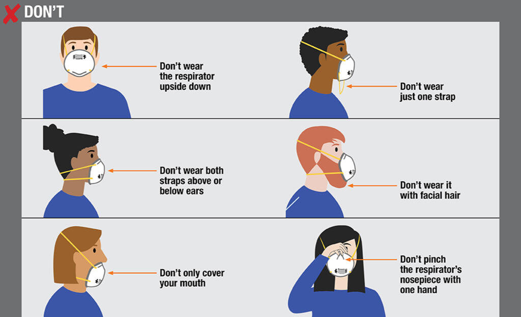 id: a graphic showing how not to wear your respirator featuring a gray background and illustrations of a people wearing a cup style N95. From left to right and top to bottom - image text: Don't! Don't wear the respirator upside down. Don't wear just one strap. Don't wear both straps above or below ears. Don't wear it with facial hair. Don't only cover your mouth. Don't pinch the respirator's nosepiece with one hand. end id.