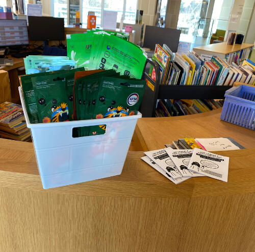 id: A photo of light colored wooden desk in a circular arc shape, with a white basket on top filled with various individually packaged respirators. Next to it are a few black and white quarter zines. Behind the desk is a book cart and more of the children’s area, sunlit with large windows. end id.