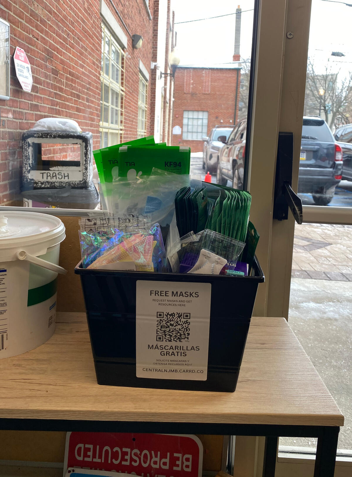 id: a photo of a black square basket featuring a free masks/mascarillas gratis qr code sticker on it, placed on a light colored wooden countertop. The basket is filled with various individually packed high filtration masks, rapid tests, and nitrile gloves.To the right of the basket is the glass office entrance door. Behind the basket is a window looking out into the parking lot, with several cars, a trash bin, and the building's brick outer wall visible. end id.