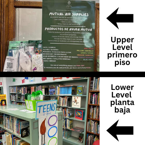 id: Two photos stacked on top of each other, the top one has an arrow pointing at it, indicating it is the upper level/primer piso. The bottom photo also has an arrow, indicating it is the lower level/planta baja. The top photo is of a window a window ledge featuring a large green mutual aid supplies poster, with a clear stickered portfolio folder full of various masks next to it. The bottom photo is of a light green double-sided bookcase in front of a wall of light green book shelving with decorative paper and artwork along the top wall. The bookcase has a rectangle sign with a light blue outline, that has the blue highlighted text: TEENS (12-18). The lime green mask basket is on the top of the bookcase, behind the TEENS sign, filled with various individually packed high filtration masks. end id.